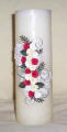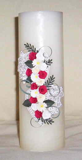 This 9" pillar candle is show with a lace background andQuilled red and cream roses
