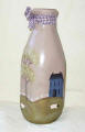 KP 8: An Old Glass milk bottle shown painted with saltbox houses, trees and sheep.. background is tan colored and finished off with a brown homespun bow. The bottle has been sealed but please only damp wipe to clean.